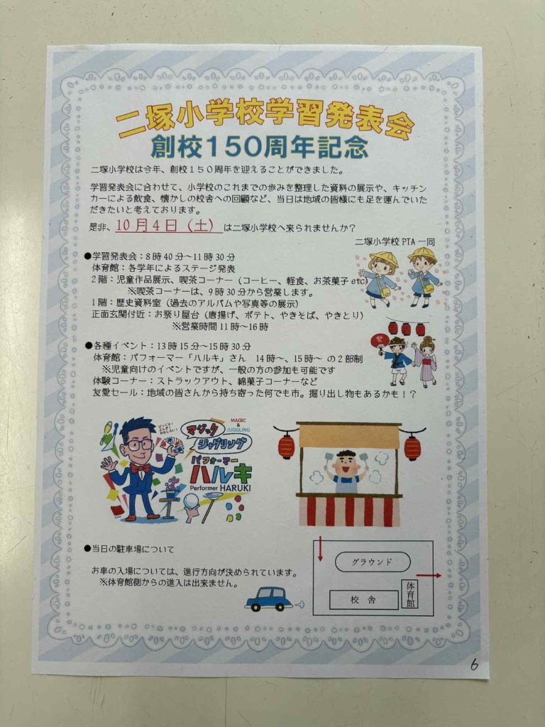 10月4日(土)高岡市立二塚小学校で開催されます学習発表会に出店させていただきます。創校150周年記念の貴重な機会にお呼びいただき光栄です!ぜひみなさまのご来場お待ちしております。